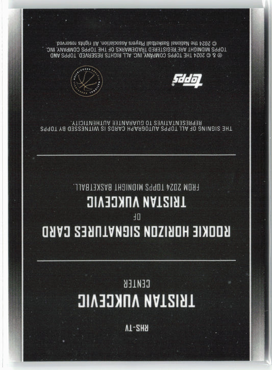 This is a nice example of a 2023-24 Topps Midnight #RHS-TV Tristan Vukcevic Rookie Horizon Signatures Other important information about this card:AUIn 2023 Tristan Vukcevic played for the Washington Wizards.Please...