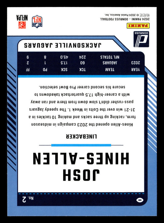 This is a nice example of a 2024 Donruss #2 Josh Hines-Allen Other important information about this card:In 2024 Josh Hines-Allen played for the Jacksonville Jaguars.Please check out our other...
