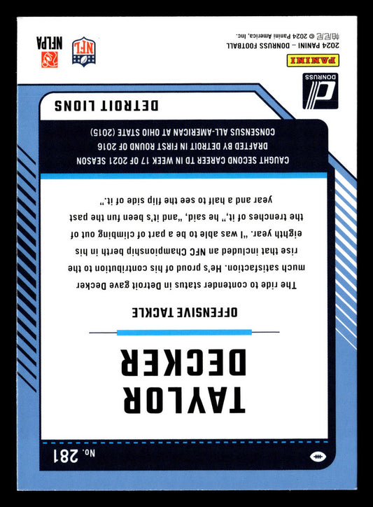 This is a nice example of a 2024 Donruss #281 Taylor Decker Other important information about this card:In 2024 Taylor Decker played for the Detroit Lions.Please check out our other...