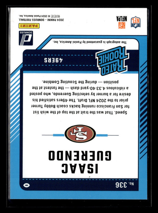 This is a nice example of a 2024 Donruss #336 Isaac Guerendo Rated Rookies Auto Other important information about this card:RCIn 2024 Isaac Guerendo played for the San Francisco 49ers.Please...