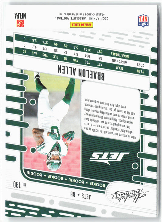 This is a nice example of a 2024 Panini Absolute #190 Braelon Allen Other important information about this card:RCIn 2024 Braelon Allen played for the New York Jets.Please check out...