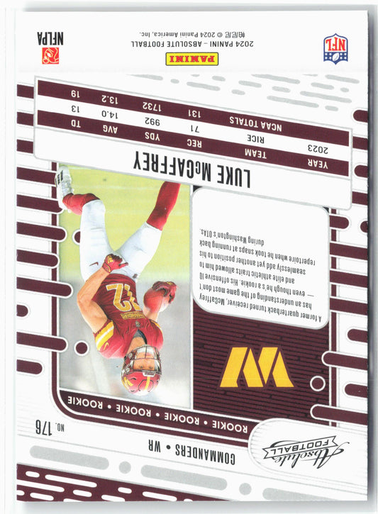 This is a nice example of a 2024 Panini Absolute #176 Luke McCaffrey Other important information about this card:RCIn 2024 Luke McCaffrey played for the Washington Commanders.Please check out our...