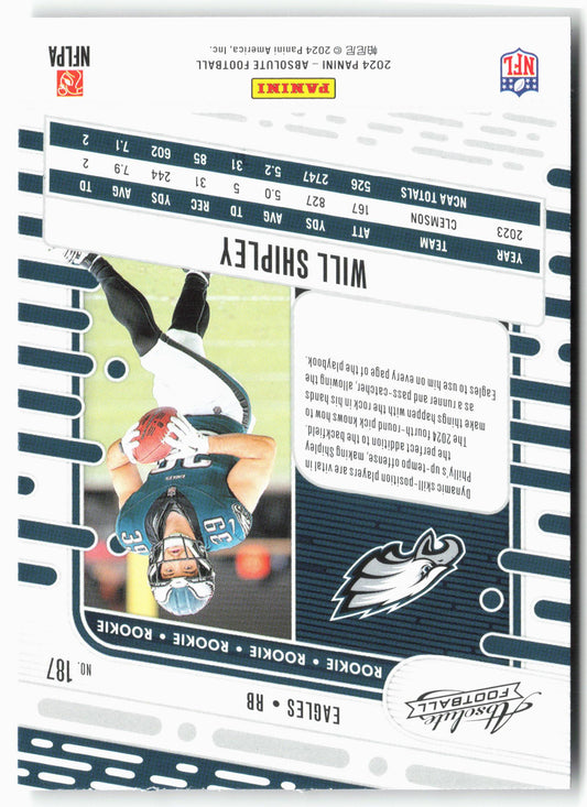 This is a nice example of a 2024 Panini Absolute #187 Will Shipley Retail Other important information about this card:RCIn 2024 Will Shipley played for the Philadelphia Eagles.Please check out...