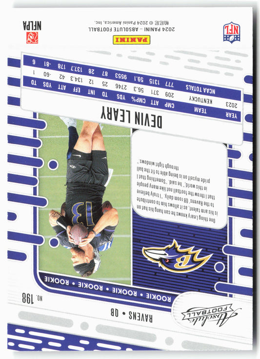This is a nice example of a 2024 Panini Absolute #198 Devin Leary Retail Other important information about this card:RCIn 2024 Devin Leary played for the Baltimore Ravens.Please check out...
