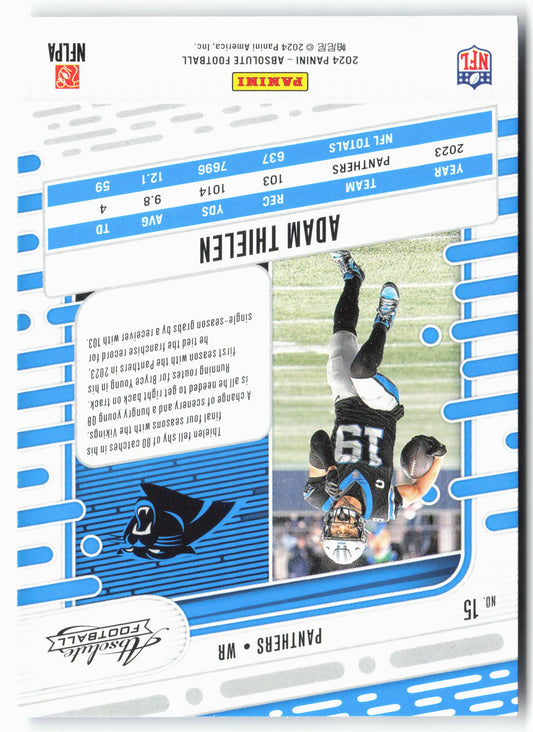 This is a nice example of a 2024 Panini Absolute #15 Adam Thielen Retail Other important information about this card:In 2024 Adam Thielen played for the Carolina Panthers.Please check out...