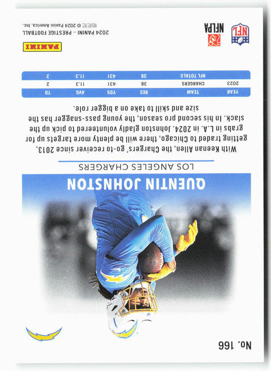 This is a nice example of a 2024 Panini Prestige #166 Quentin Johnston Other important information about this card:In 2024 Quentin Johnston played for the Los Angeles Chargers.Please check out...