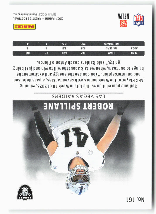 This is a nice example of a 2024 Panini Prestige #161 Robert Spillane Other important information about this card:In 2024 Robert Spillane played for the Las Vegas Raiders.Please check out...