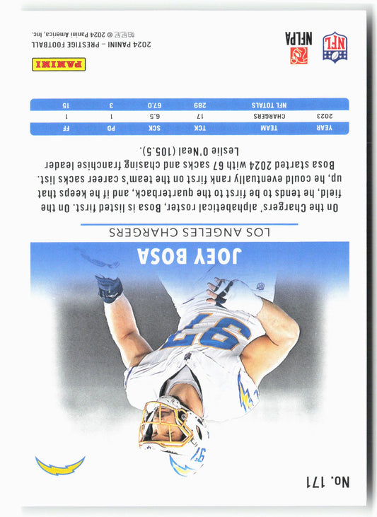 This is a nice example of a 2024 Panini Prestige #171 Joey Bosa Other important information about this card:In 2024 Joey Bosa played for the Los Angeles Chargers.Please check out...