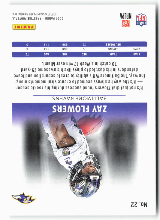 This is a nice example of a 2024 Panini Prestige #22 Zay Flowers Other important information about this card:In 2024 Zay Flowers played for the Baltimore Ravens.Please check out our...