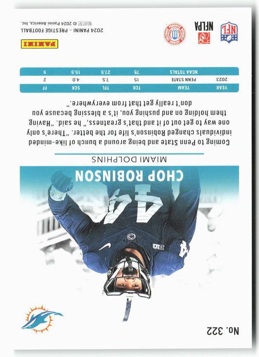 This is a nice example of a 2024 Panini Prestige #322 Chop Robinson Green Xtra Points Other important information about this card:SN,RCIn 2024 Chop Robinson played for the Miami Dolphins.Please...