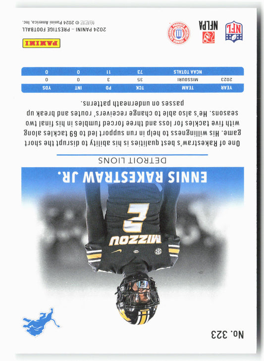 This is a nice example of a 2024 Panini Prestige #323 Ennis Rakestraw Other important information about this card:RCIn 2024 Ennis Rakestraw played for the Detroit Lions.Please check out our...