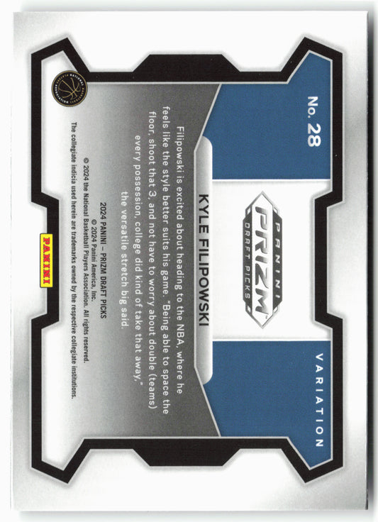 This is a nice example of a 2024 Panini Prizm Draft Picks #28b Kyle Filipowski Other important information about this card:In 2024 Kyle Filipowski played for the Duke Blue Devils.Please...