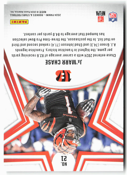 This is a nice example of a 2024 Panini Rookies & Stars #21 Ja'Marr Chase Other important information about this card:In 2024 Ja'Marr Chase played for the Cincinnati Bengals.Please check...