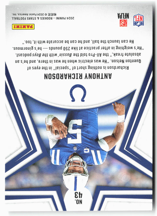 This is a nice example of a 2024 Panini Rookies & Stars #43 Anthony Richardson Other important information about this card:In 2024 Anthony Richardson played for the Indianapolis Colts.Please check...