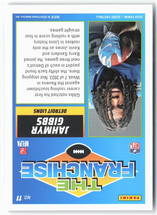 This is a nice example of a 2024 Score #11 Jahmyr Gibbs The Franchise Other important information about this card:In 2024 Jahmyr Gibbs played for the Detroit Lions.Please check out...