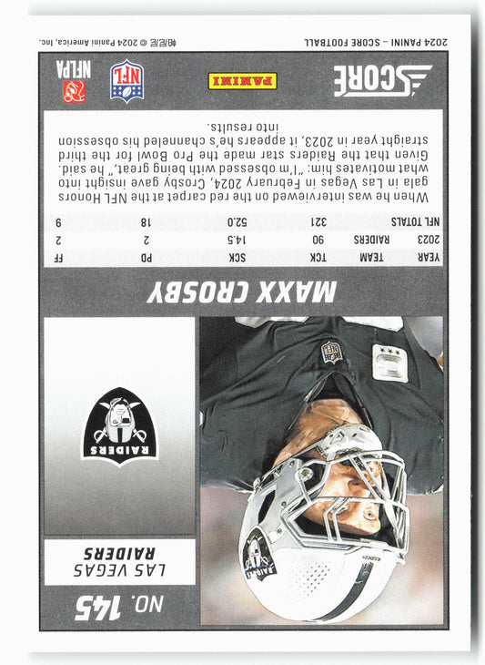 This is a nice example of a 2024 Score #145 Maxx Crosby Other important information about this card:In 2024 Maxx Crosby played for the Las Vegas Raiders.Please check out our...