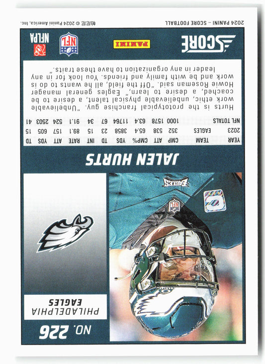 This is a nice example of a 2024 Score #226 Jalen Hurts Other important information about this card:In 2024 Jalen Hurts played for the Philadelphia Eagles.Please check out our other...