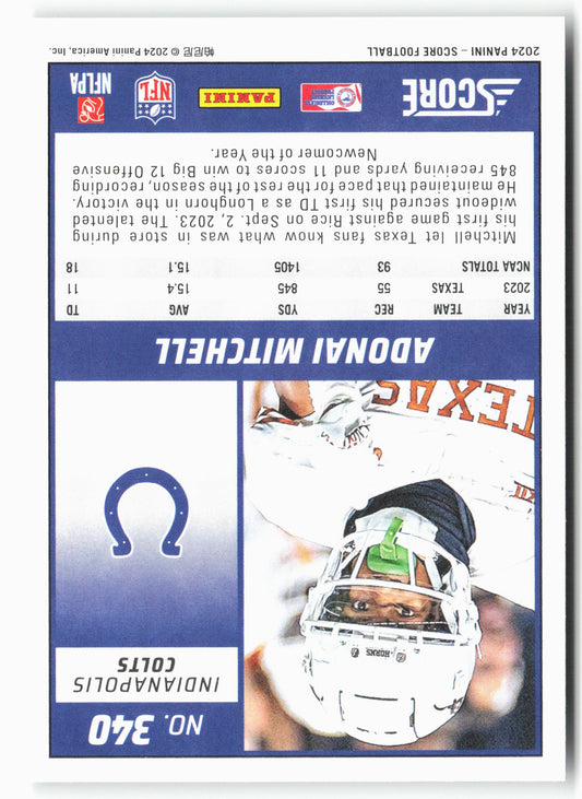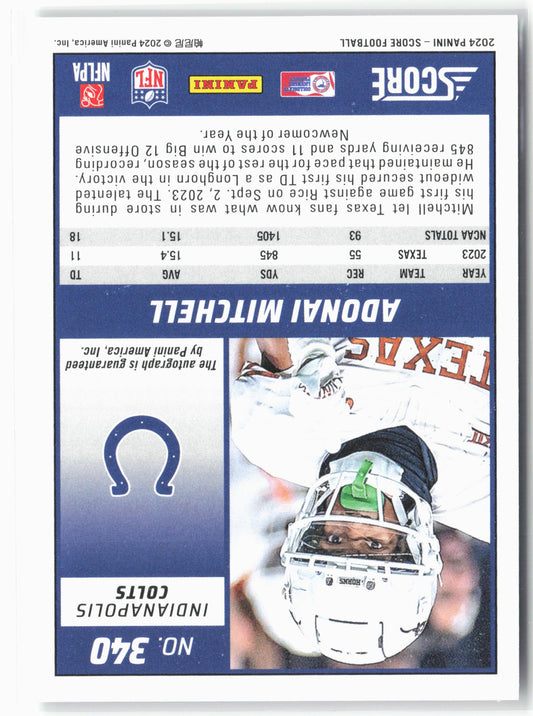 This is a nice example of a 2024 Score #340 Adonai Mitchell Other important information about this card:RCIn 2024 Adonai Mitchell played for the Indianapolis Colts.Please check out our other...