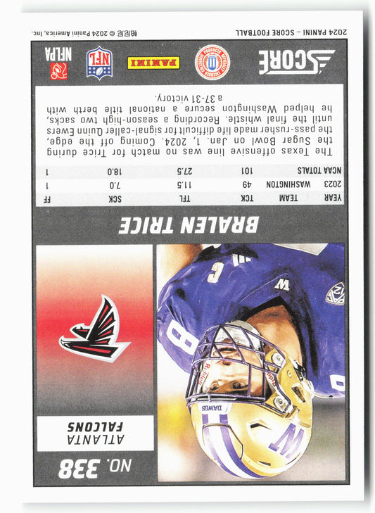 This is a nice example of a 2024 Score #338 Bralen Trice Other important information about this card:RCIn 2024 Bralen Trice played for the Atlanta Falcons.Please check out our other...