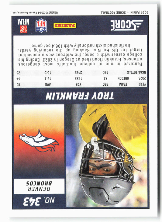This is a nice example of a 2024 Score #343 Troy Franklin Other important information about this card:RCIn 2024 Troy Franklin played for the Denver Broncos.Please check out our other...