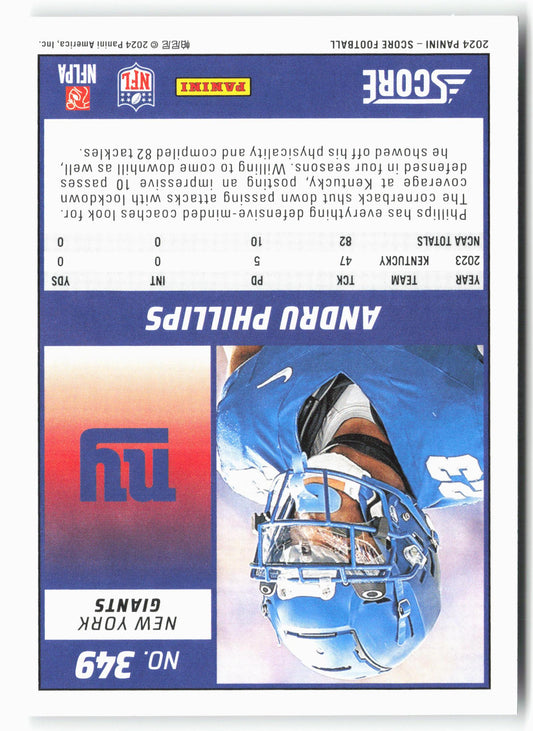 This is a nice example of a 2024 Score #349 Andru Phillips Other important information about this card:RCIn 2024 Andru Phillips played for the New York Giants.Please check out our...