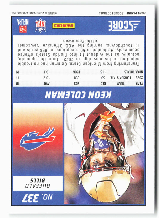 This is a nice example of a 2024 Score #337 Keon Coleman Other important information about this card:RCIn 2024 Keon Coleman played for the Buffalo Bills.Please check out our other...