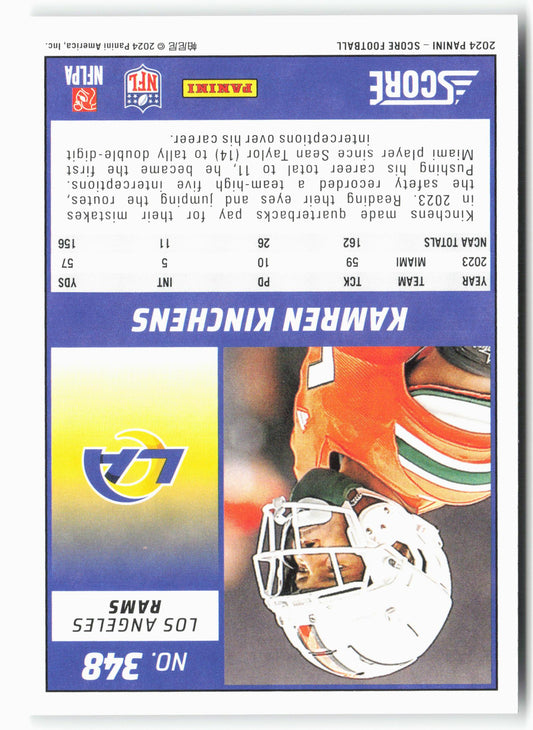 This is a nice example of a 2024 Score #348 Kamren Kinchens Showcase Other important information about this card:SN,RCIn 2024 Kamren Kinchens played for the Los Angeles Rams.Please check out...