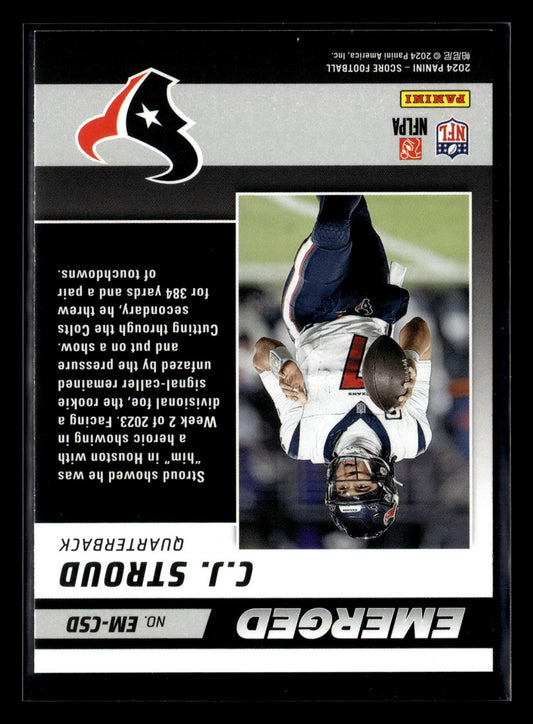 This is a nice example of a 2024 Score #EM-CSD C.J. Stroud Emerged Other important information about this card:In 2024 C.J. Stroud played for the Houston Texans.Please check out our...