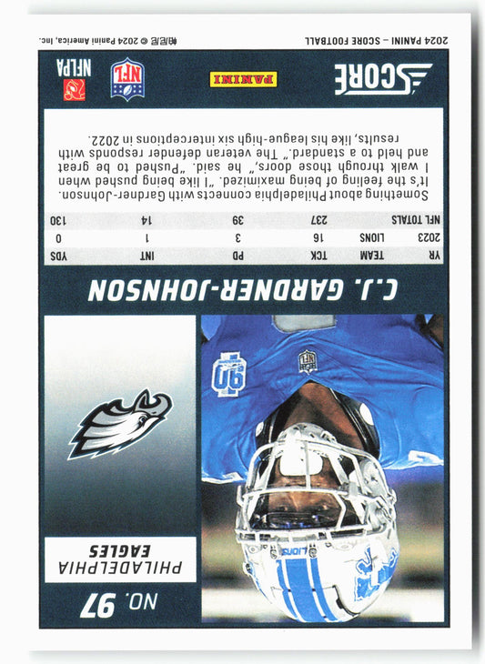 This is a nice example of a 2024 Score #97 C.J. Gardner-Johnson Other important information about this card:In 2024 C.J. Gardner-Johnson played for the Philadelphia Eagles.Please check out our other...