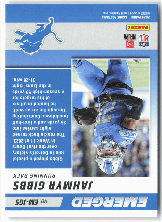 This is a nice example of a 2024 Score #EM-JGS Jahmyr Gibbs Emerged Other important information about this card:In 2024 Jahmyr Gibbs played for the Detroit Lions.Please check out our...