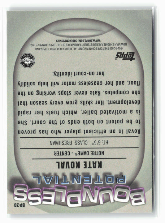 This is a nice example of a 2024-25 Bowman University Chrome #BP-20 Kate Koval Boundless Potential Other important information about this card:In 2024 Kate Koval played for the Notre Dame...