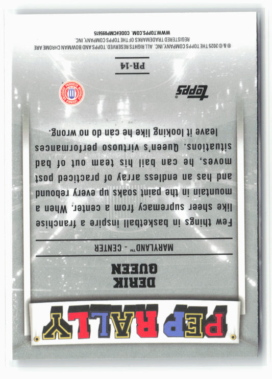 This is a nice example of a 2024-25 Bowman University Chrome #PR-14 Derik Queen Pep Rally Other important information about this card:In 2024 Derik Queen played for the Maryland Terrapins.Please...