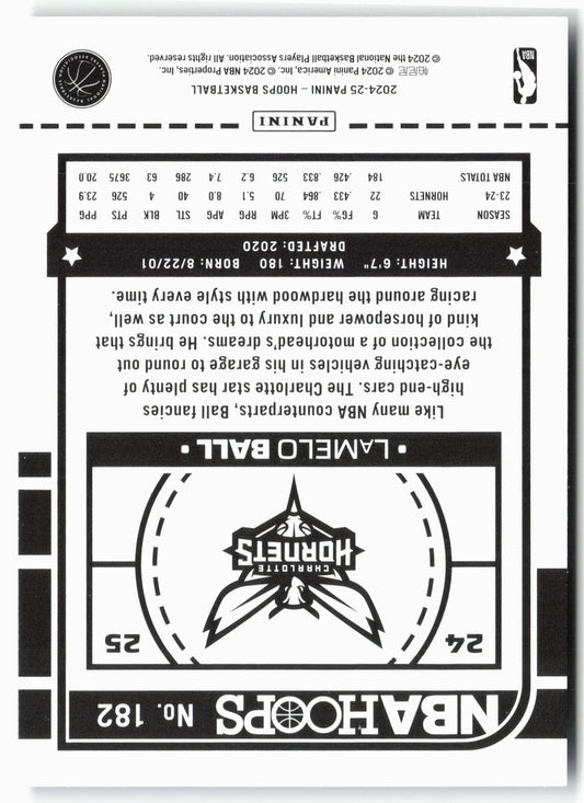 This is a nice example of a 2024-25 Hoops #182 LaMelo Ball Premium Other important information about this card:In 2024 LaMelo Ball played for the Charlotte Hornets.Please check out our...