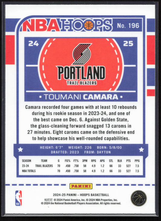 This is a nice example of a 2024-25 Hoops #196 Toumani Camara Other important information about this card:In 2024 Toumani Camara played for the Portland Trail Blazers.Please check out our...