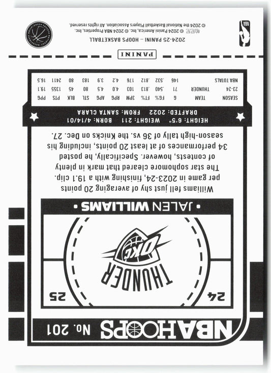 This is a nice example of a 2024-25 Hoops #201 Jalen Williams Other important information about this card:In 2024 Jalen Williams played for the Oklahoma City Thunder.Please check out our...