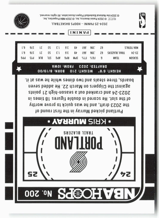 This is a nice example of a 2024-25 Hoops #200 Kris Murray Other important information about this card:In 2024 Kris Murray played for the Portland Trail Blazers.Please check out our...