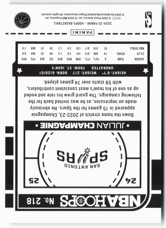 This is a nice example of a 2024-25 Hoops #218 Julian Champagnie Other important information about this card:In 2024 Julian Champagnie played for the San Antonio Spurs.Please check out our...