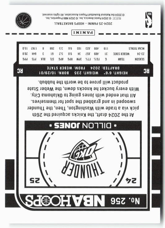 This is a nice example of a 2024-25 Hoops #256 Dillon Jones Other important information about this card:RCIn 2024 Dillon Jones played for the Oklahoma City Thunder.Please check out our...