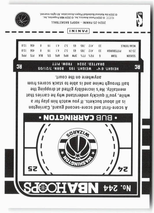 This is a nice example of a 2024-25 Hoops #244 Bub Carrington Other important information about this card:RCIn 2024 Bub Carrington played for the Washington Wizards.Please check out our other...