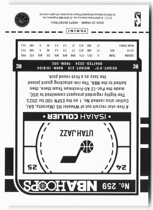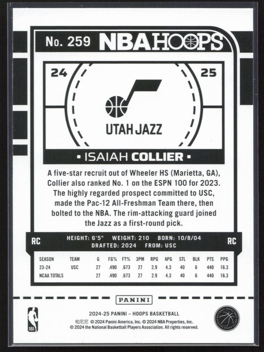 This is a nice example of a 2024-25 Hoops #259 Isaiah Collier Other important information about this card:RCIn 2024 Isaiah Collier played for the Utah Jazz.Please check out our other...
