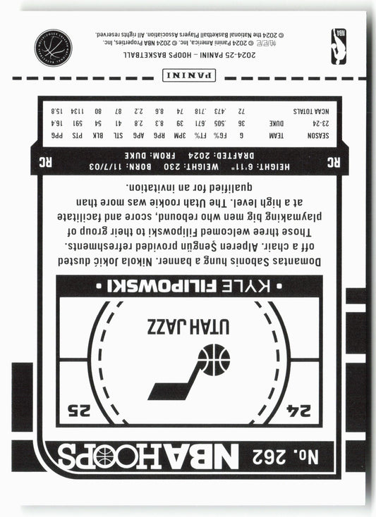 This is a nice example of a 2024-25 Hoops #262 Kyle Filipowski Other important information about this card:RCIn 2024 Kyle Filipowski played for the Utah Jazz.Please check out our other...