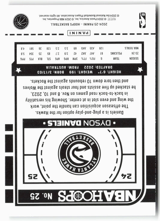 This is a nice example of a 2024-25 Hoops #25 Dyson Daniels Other important information about this card:In 2024 Dyson Daniels played for the Atlanta Hawks.Please check out our other...