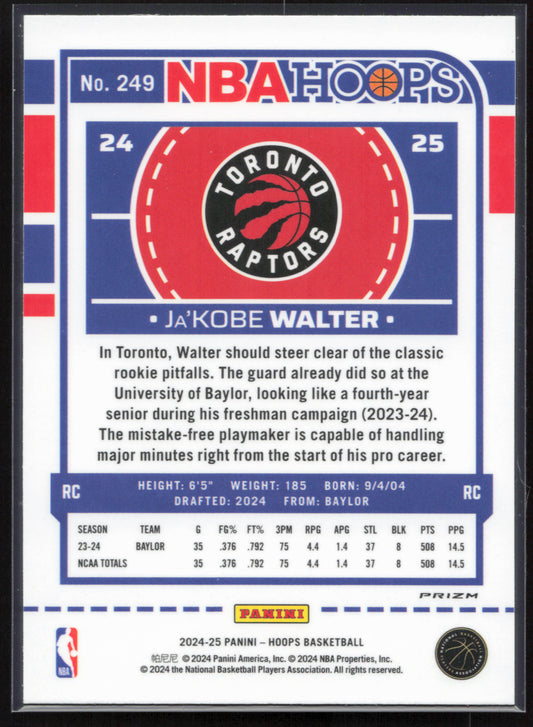 This is a nice example of a 2024-25 Hoops #249 Ja'Kobe Walter Premium Prizms Silver Other important information about this card:RCIn 2024 Ja'Kobe Walter played for the Toronto Raptors.Please check...