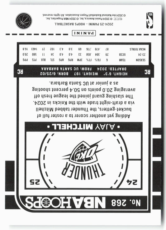 This is a nice example of a 2024-25 Hoops #268 Ajay Mitchell Other important information about this card:RCIn 2024 Ajay Mitchell played for the Oklahoma City Thunder.Please check out our...