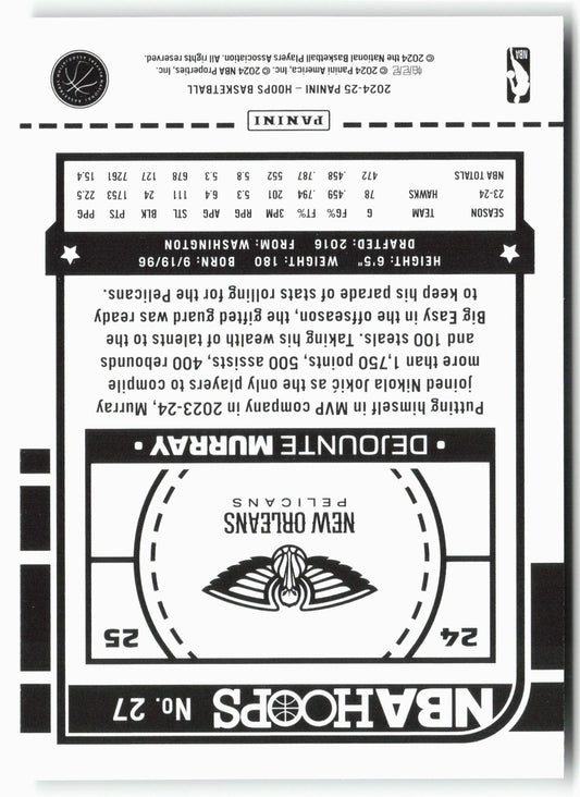 This is a nice example of a 2024-25 Hoops #27 Dejounte Murray Other important information about this card:In 2024 Dejounte Murray played for the New Orleans Pelicans.Please check out our...