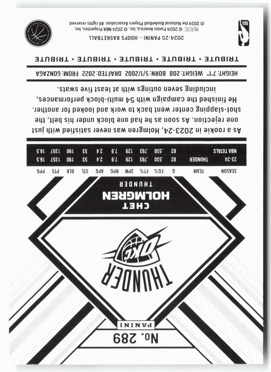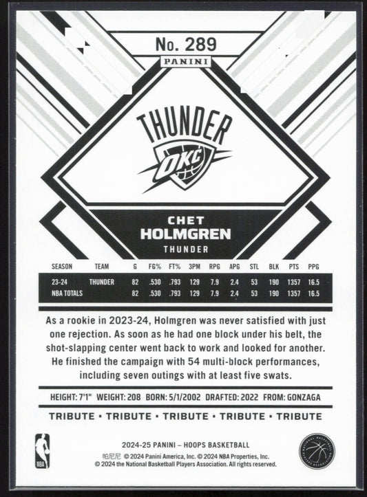 This is a nice example of a 2024-25 Hoops #289 Chet Holmgren Other important information about this card:In 2024 Chet Holmgren played for the Oklahoma City Thunder.Please check out our...