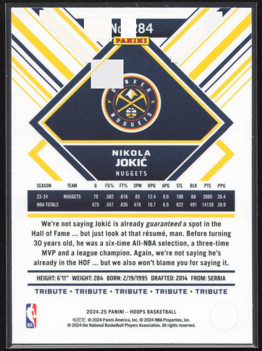 This is a nice example of a 2024-25 Hoops #284 Nikola Jokic Premium Prizms Silver Other important information about this card:In 2024 Nikola Jokic played for the Denver Nuggets.Please check...