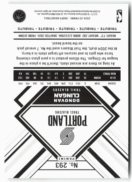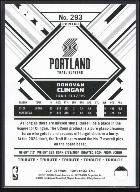 This is a nice example of a 2024-25 Hoops #293 Donovan Clingan Other important information about this card:In 2024 Donovan Clingan played for the Portland Trail Blazers.Please check out our...