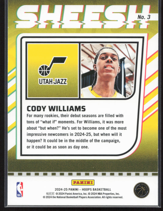 This is a nice example of a 2024-25 Hoops #3 Cody Williams Sheesh Other important information about this card:In 2024 Cody Williams played for the Utah Jazz.Please check out our...