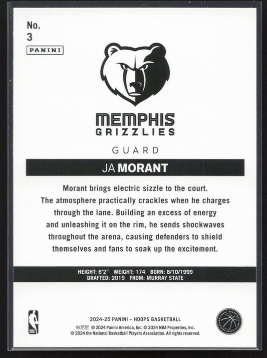 This is a nice example of a 2024-25 Hoops #3 Ja Morant Hoops Throwback Other important information about this card:In 2024 Ja Morant played for the Memphis Grizzlies.Please check out...